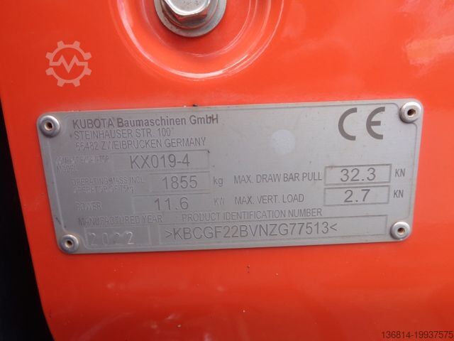 Machine no. 3192, Kubota KX019-4 mini excavator, year: 2022, operating hours: 860, operating weight: 1,855 kg, mechanical quick coupler QC01, 1 x hydraulic grading bucket 1,200 mm, 3 x buckets (30 / 60 / 60), 230 mm rubber tracks, hydraulically extendable undercarriage, dozer blade, full cab with ventilation/heating, fast travel, hydraulic connections for attachments, work lights, beacon, Kubota diesel engine with 11.6 kW. For enquiries, please note: subject to errors and prior sale.