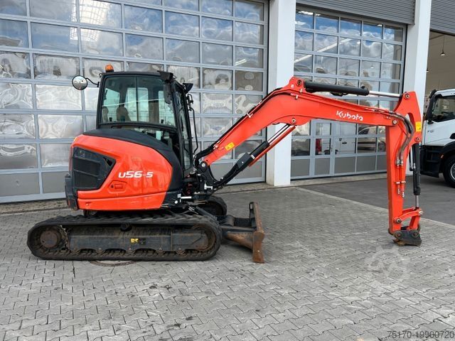 Kubota U056-5 compact excavator, year of manufacture: 2022, operating hours: 1,462 h, dozer blade, engine: Kubota [35 kW/48 hp], hammer/grapple hydraulic circuit (AUX I & AUX II), weight: 5,595 kg, good condition, immediately operational.