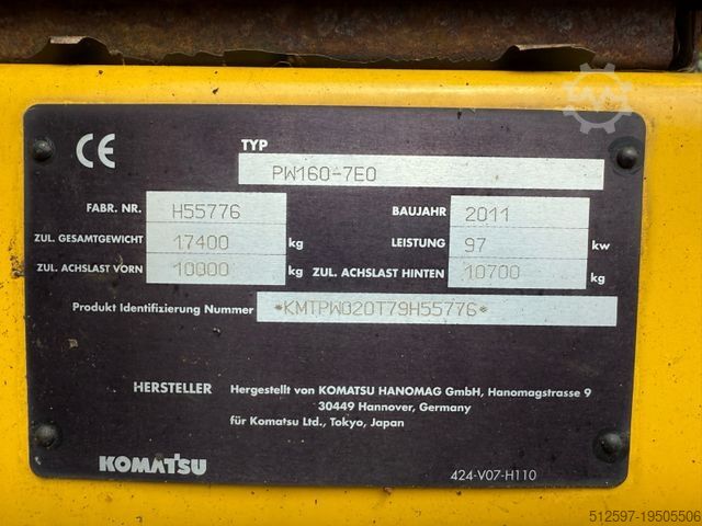 Well-maintained Komatsu PW 160-7E0 wheeled excavator