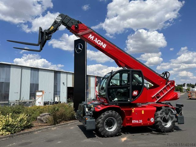 Magni RTH 6.25 SH telescopic handler, year of construction: 2024, brand new, Magni quick coupler, pallet fork, radio remote control, preparation for work platform, 3rd hydraulic circuit, air conditioning, overpressure cabin, radio/CD, touch screen display, ROPS/FOBS cab, engine: Deutz [100kW/136HP], automatic leveling, variable outriggers, 20km/h (optional 40km/h), maximum lifting height: 25.00m, horizontal reach: 21.20m, maximum lifting capacity: 6.000kg, weight: 18.500kg,