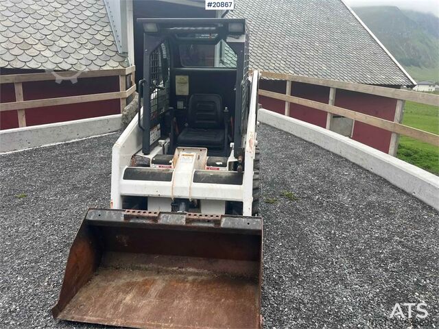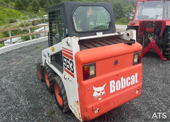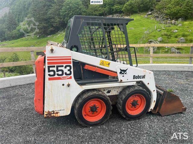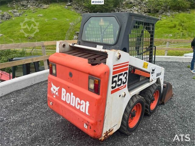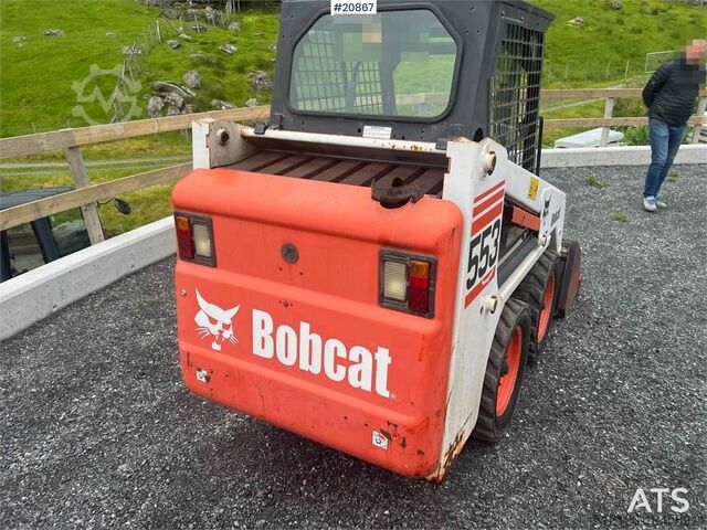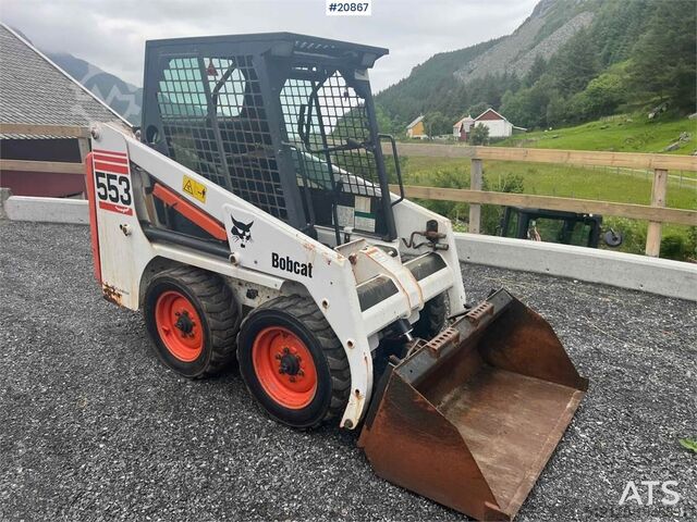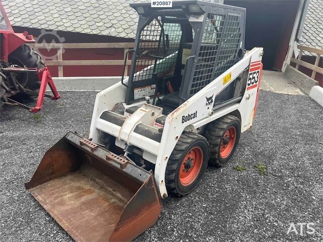 В продаже компактный погрузчик Bobcat 553 2004 года выпуска с ковшом и паллетными вилами.