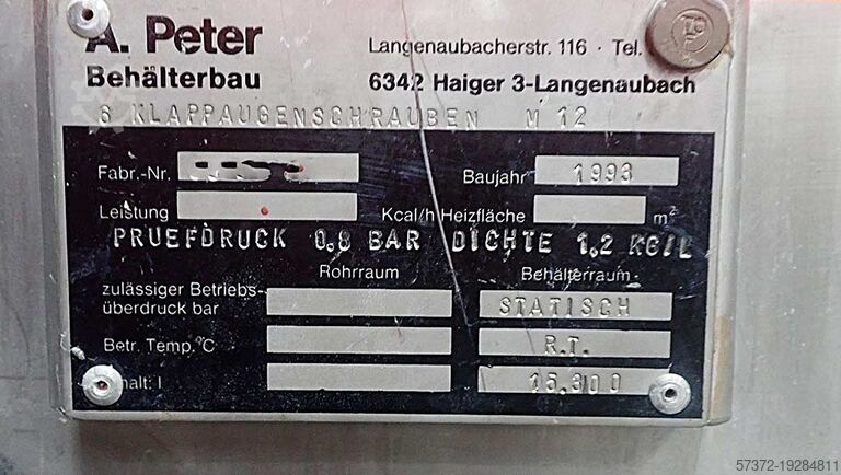 Доступно несколько резервуаров из нержавеющей стали различных размеров. 1) 1 резервуар из нержавеющей стали, построен в 1997 году, объем: 30 м³. 2) 3 резервуара из нержавеющей стали от A. Peter Behälterbau, построены в 1993 году, объем: 15,3 м³, макс. температура: комнатная, рабочее давление: статическое, испытательное давление: 0,8 бар, средняя плотность: 1,2 кг/л. 3) 8 резервуаров из нержавеющей стали, построены в 2004 году, объем: 4,8 м³. Возможен осмотр на месте.